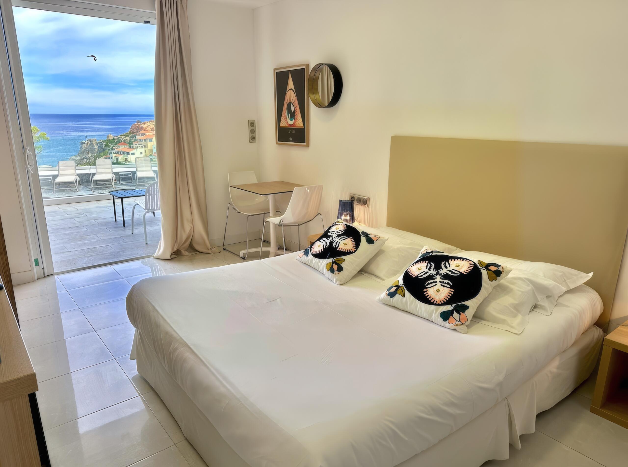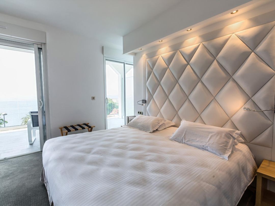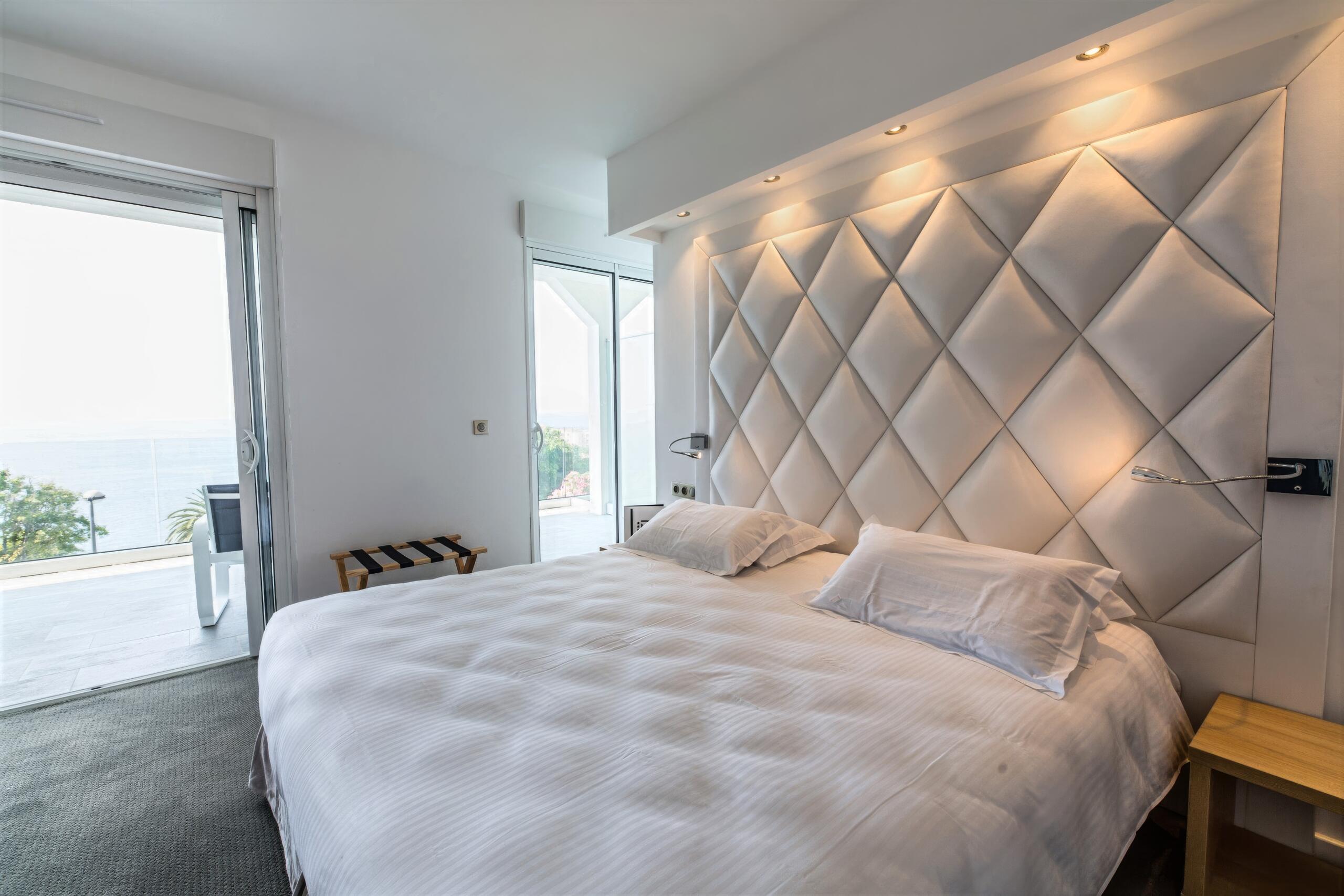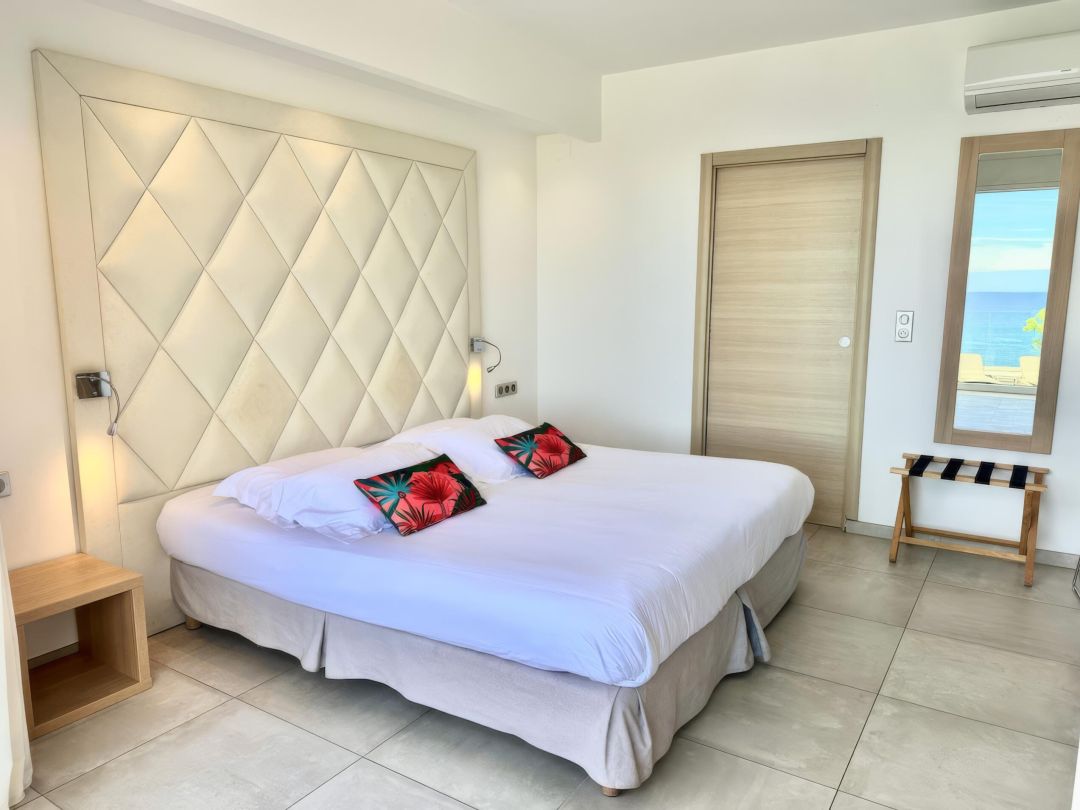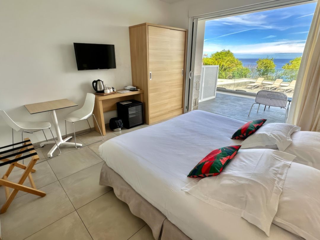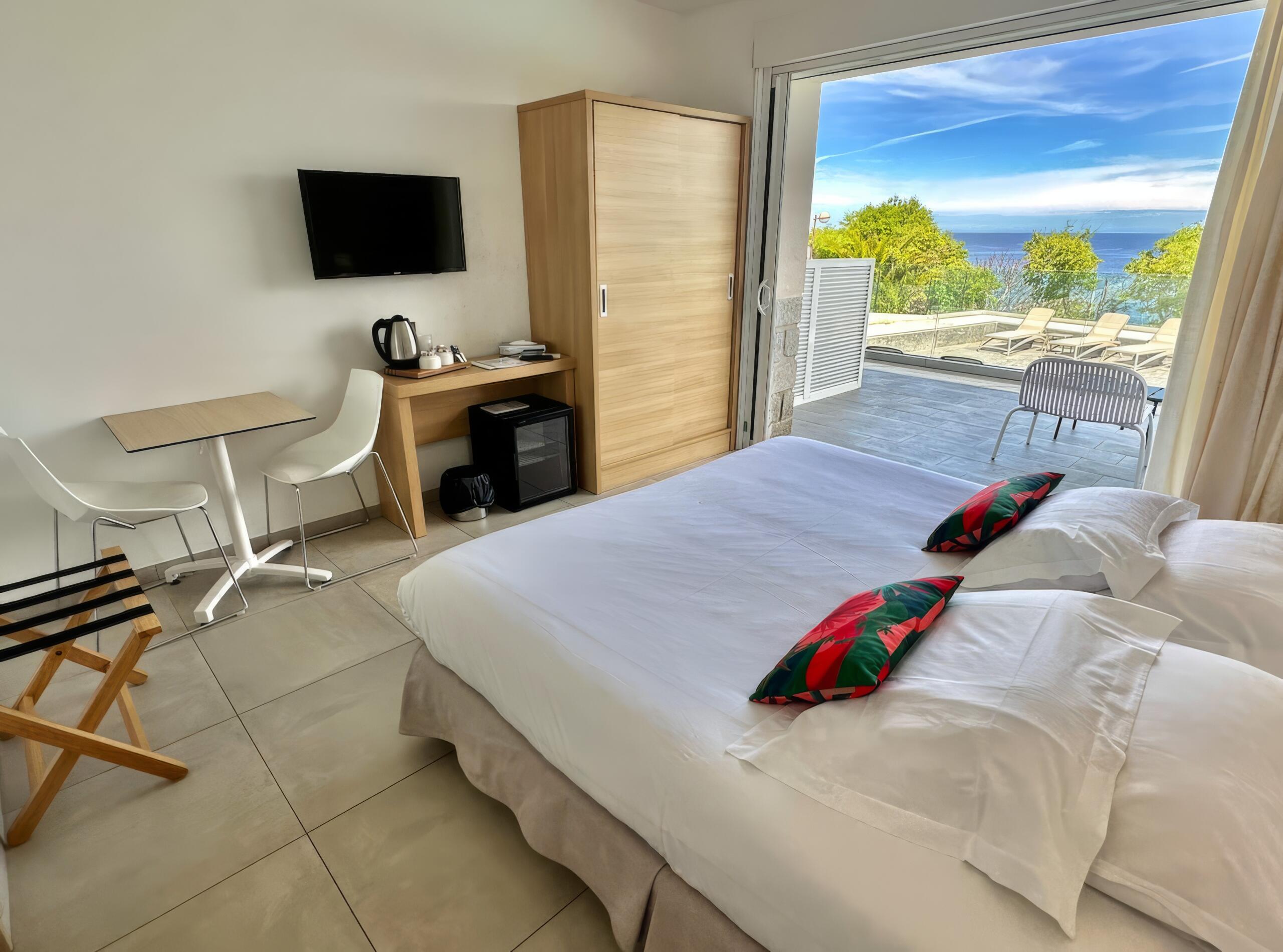 Située à l'étage de la villa, cette chambre offre une vue dégagée et une atmosphère paisible. Idéale pour celles et ceux qui aiment prendre de la hauteur et profiter d’une vue mer imprenable sans quitter leur lit.