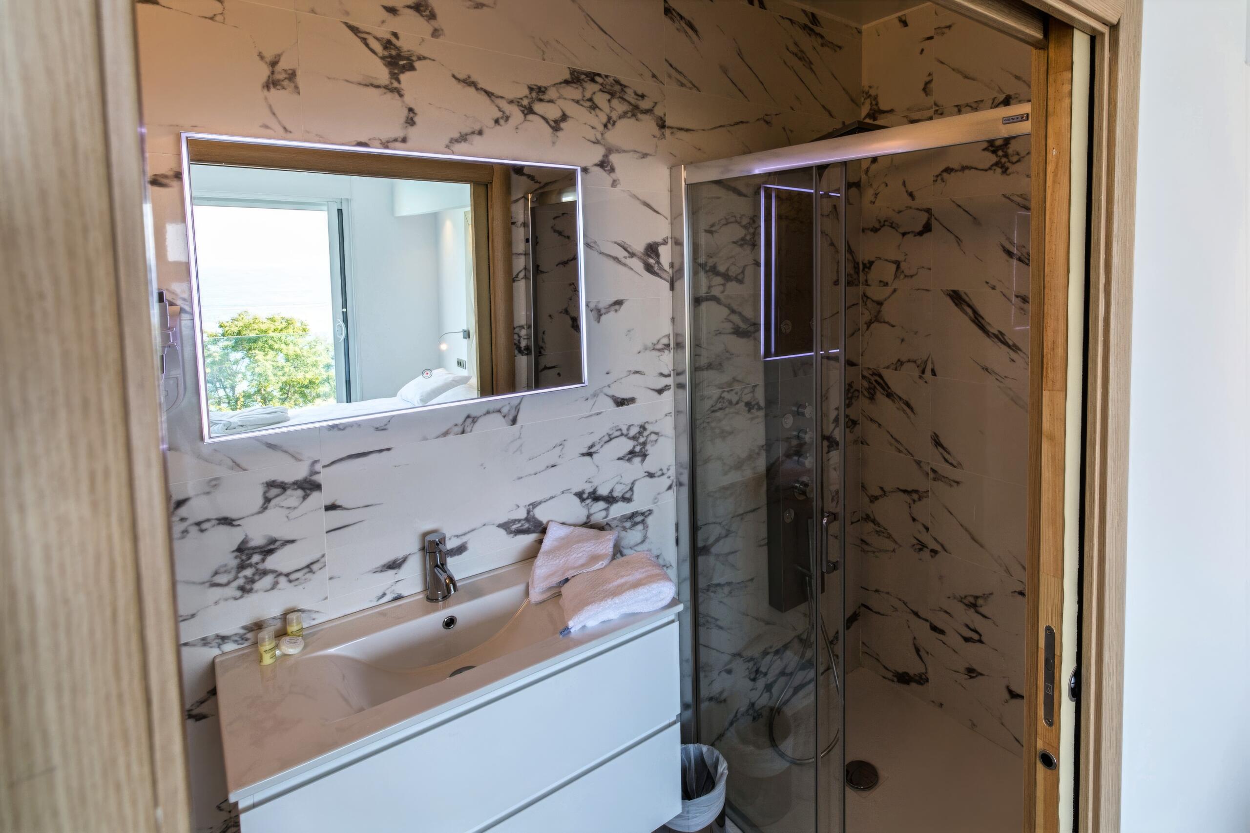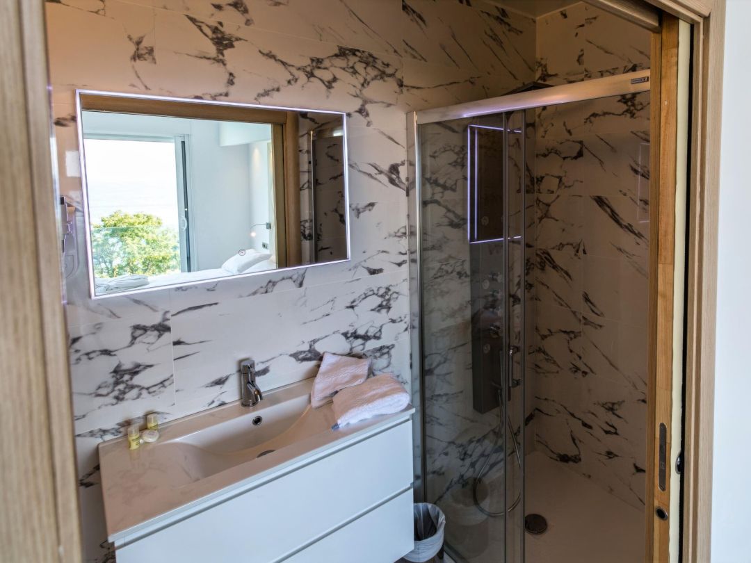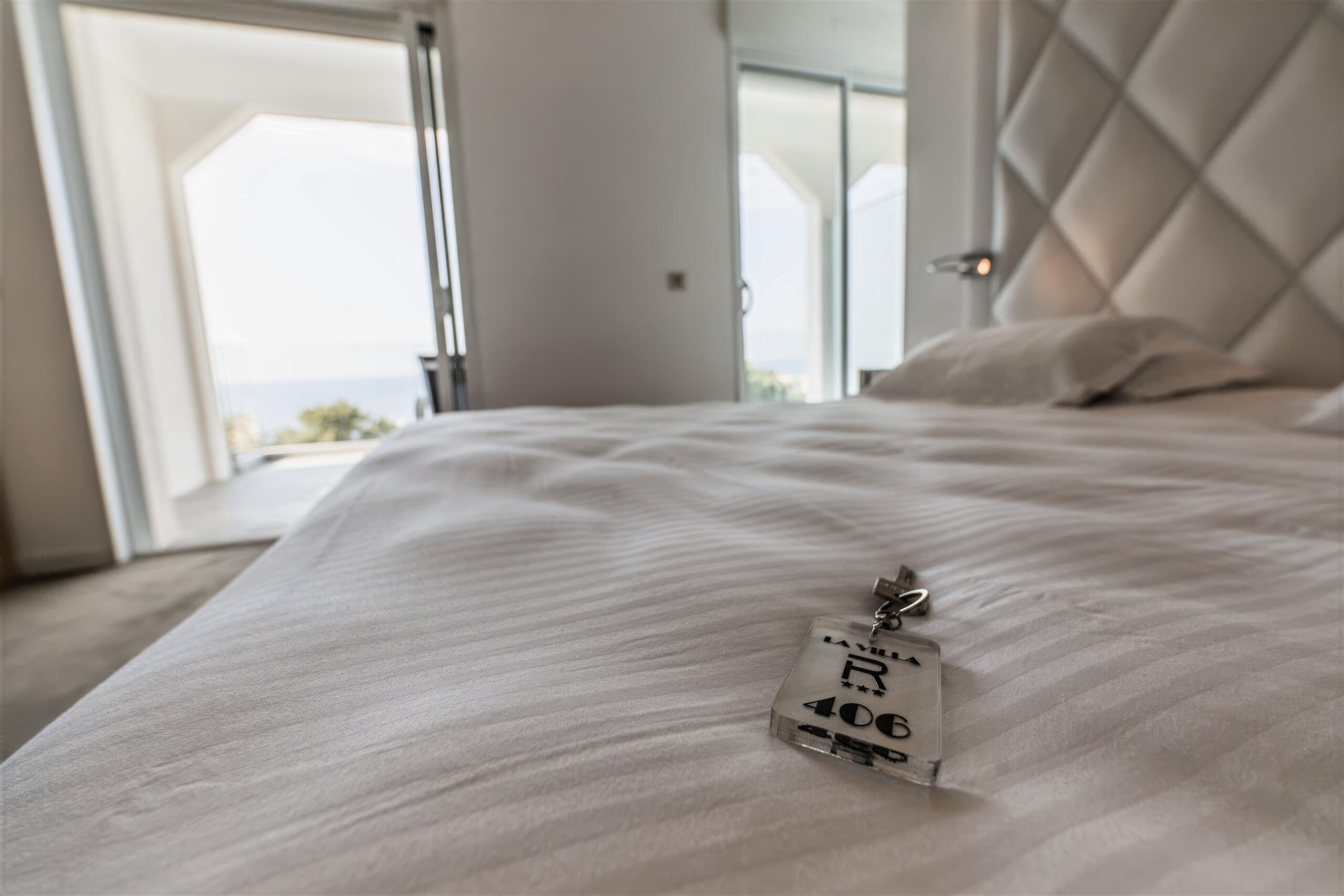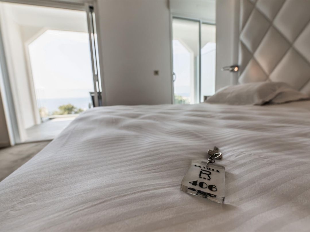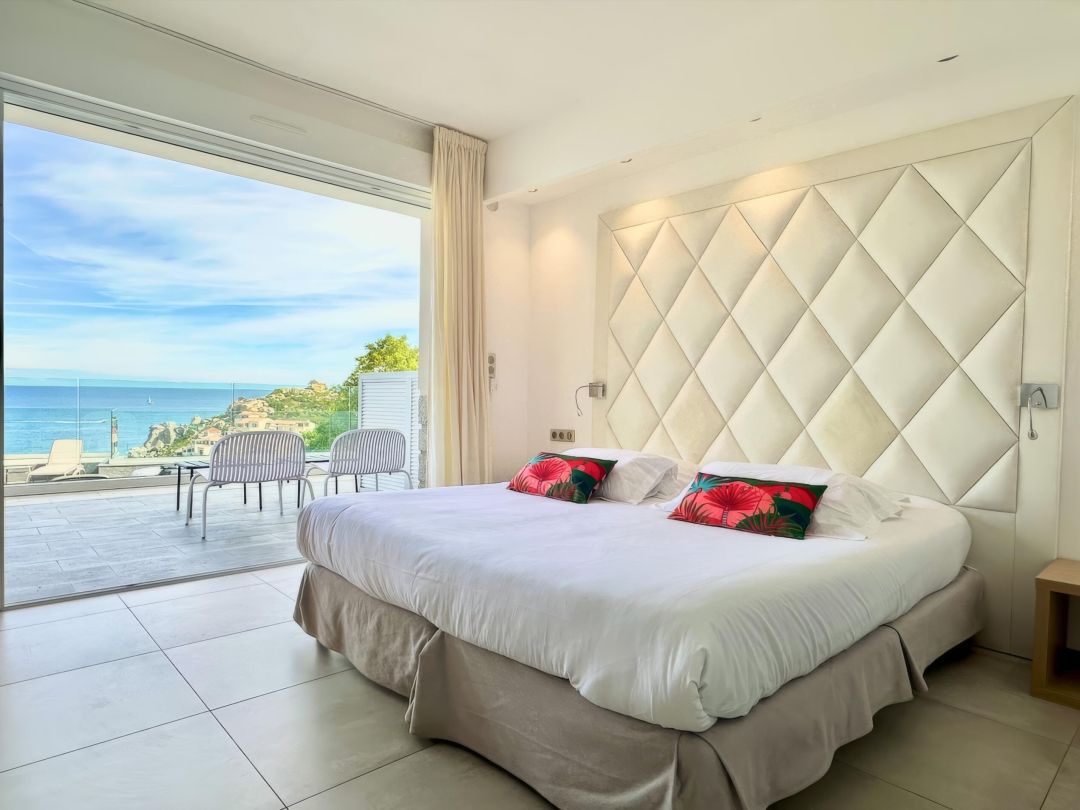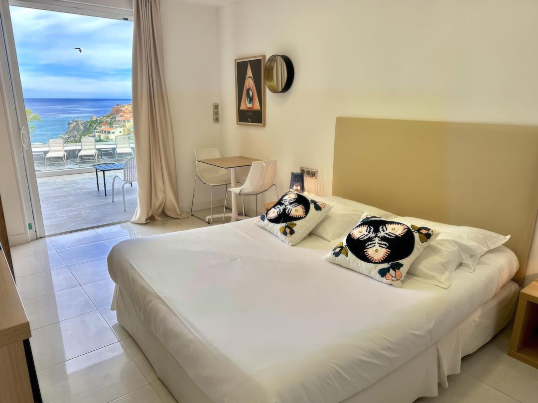 Située à l'étage de la villa, cette chambre offre une vue dégagée et une atmosphère paisible. Idéale pour celles et ceux qui aiment prendre de la hauteur et profiter d’une vue mer imprenable sans quitter leur lit.