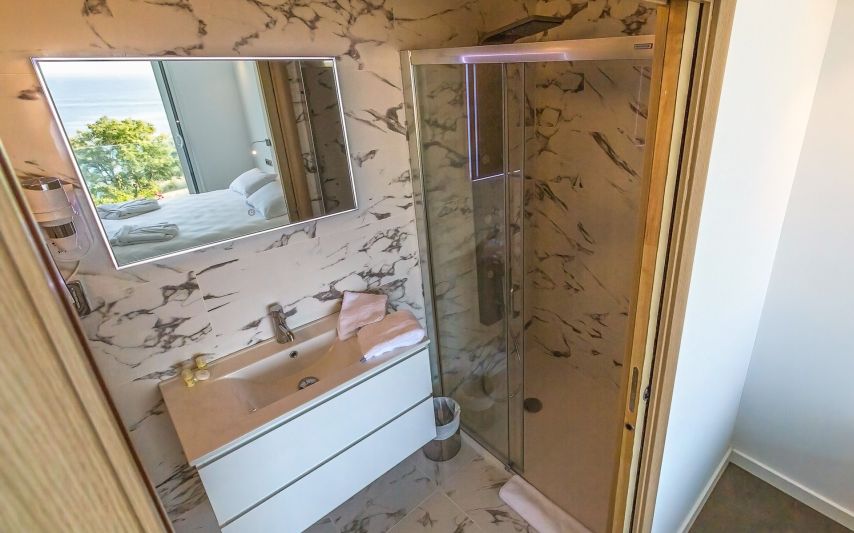 Les chambres At the top + sont situées à l’étage de la villa. Elles bénéficient d’une terrasse avec vue mer imprenable. Elles disposent d’une literie king size (180cm) avec possibilité de lits séparés.